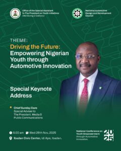 The event, themed *“Driving the Future: Empowering Nigerian Youth through Automotive Innovation,”* is being organised by the Office of the Special Assistant to the President on Youth Initiatives in collaboration with the National Automotive Design and Development Council (NADDC). It will take place at The Civic Centre, Ibadan at 9:00 am.